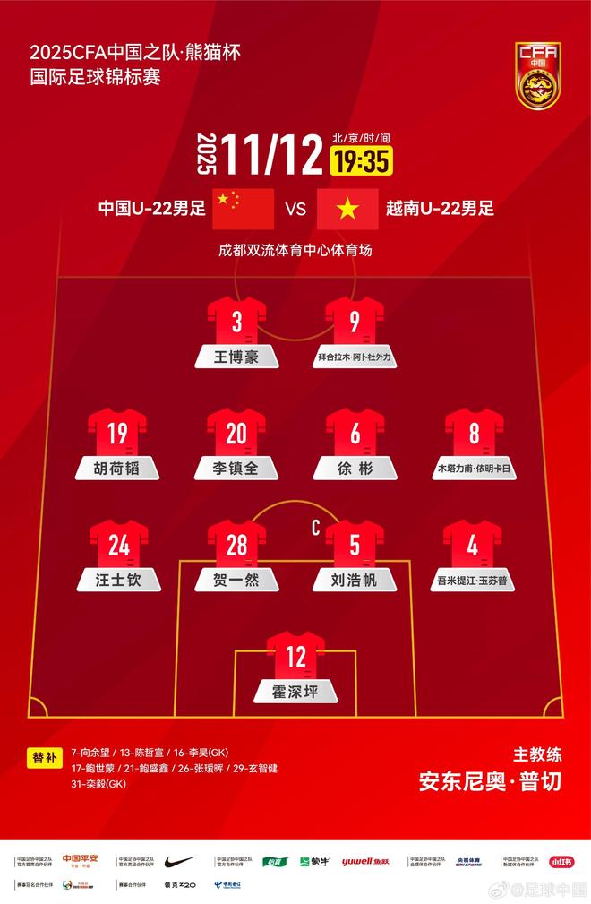北京时间11月12日19:35,熊猫杯国际邀请赛,中国U22将对阵越南U22,赛前双方公布首发: