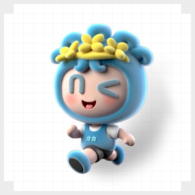 作为合肥马拉松的官方“吉祥物”,合合有着圆滚滚的头、象征巢湖的浪花样蓝色卷发,戴着簪有合肥市市花桂花的空顶小黄帽。它穿着印有“合合”字样的蓝色背心,一边wink一边奔跑。